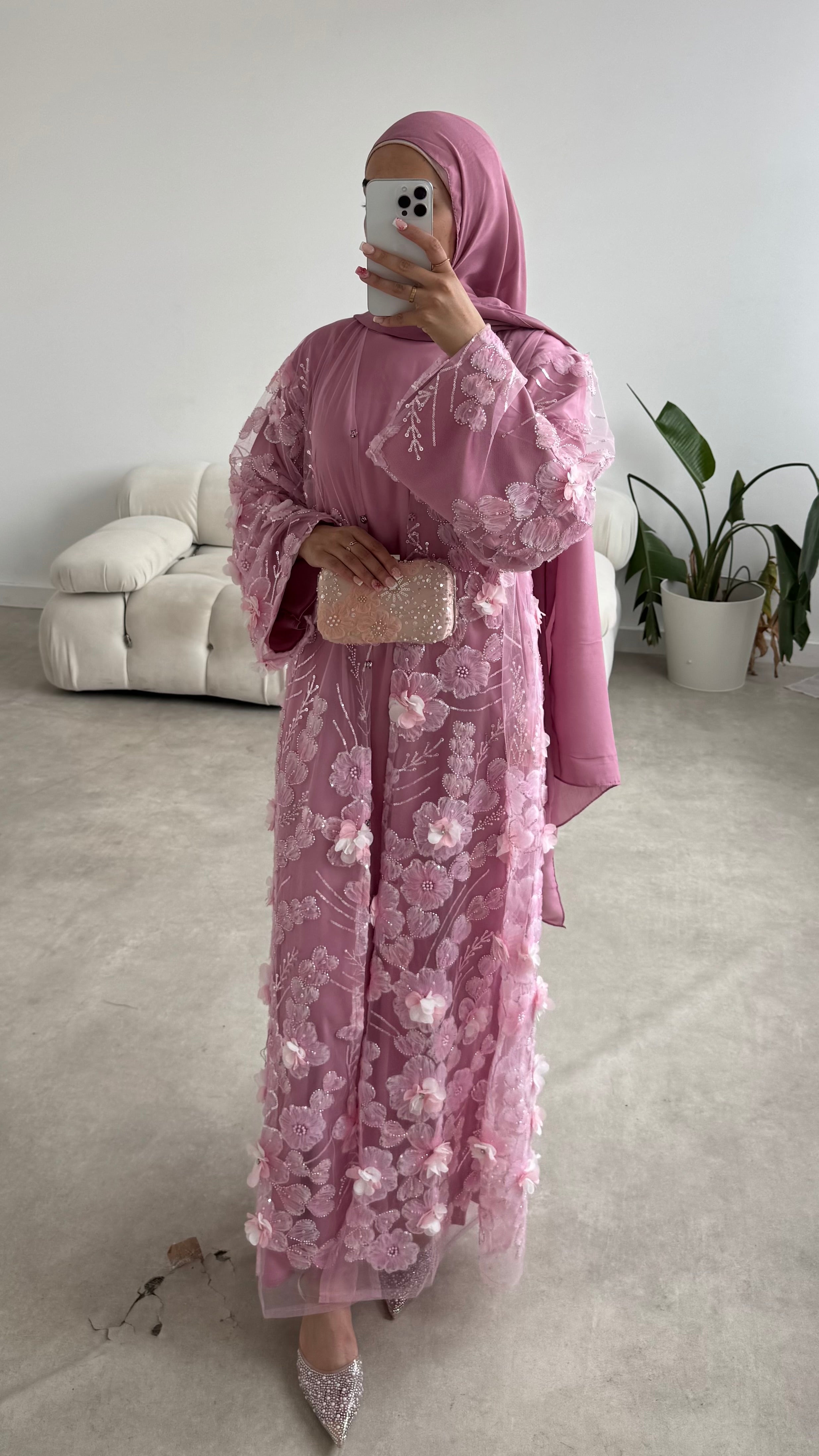 Crafted for your most treasured moments, the Amora Abaya is a true statement of elegance. This couture-inspired piece features hand-finished 4D florals, delicate sequin work, and romantic heart-shaped petals — layered over a soft tulle canvas that moves with ethereal grace.
