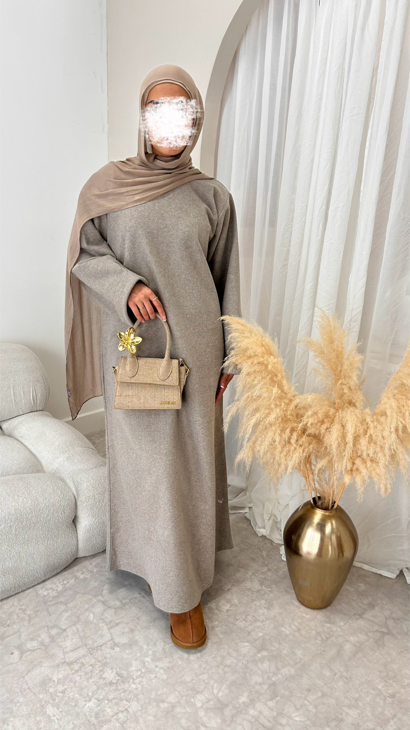 A softly structured abaya designed to keep you warm and elegant through the colder months. Crafted from ‘wool brush’ a weighted fabric with a relaxed drape, wide sleeves and deep pockets for ease and movement. Comes with a matching hijab and optional belt so you can style it your way — comfort, warmth and understated sophistication in one timeless piece for days out, school or work!