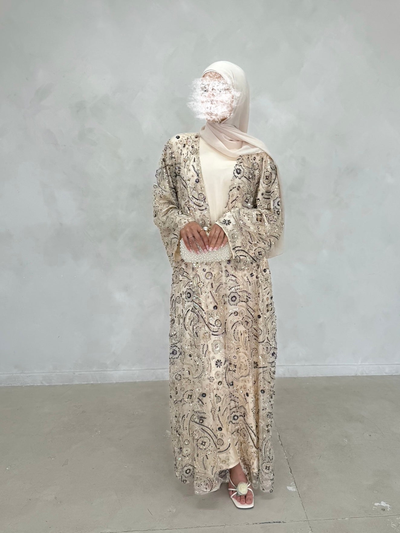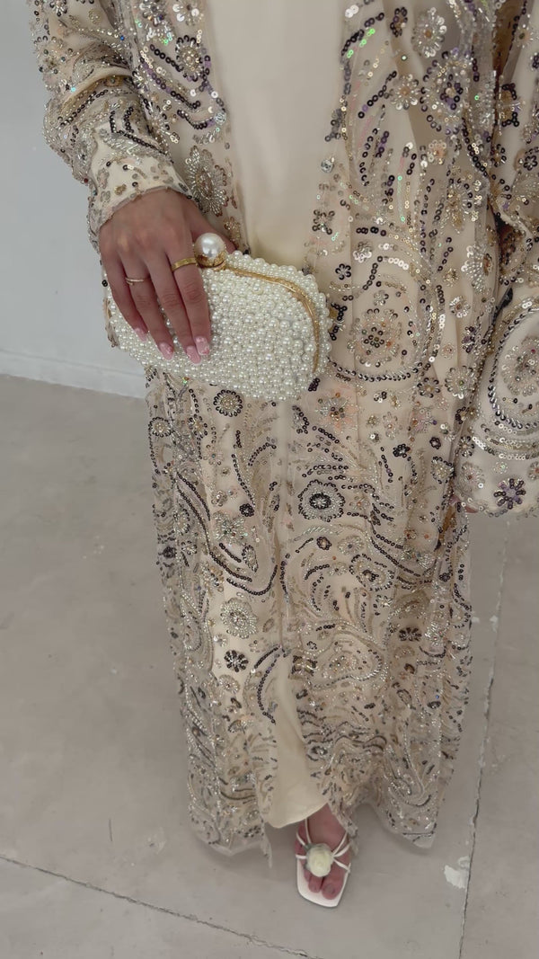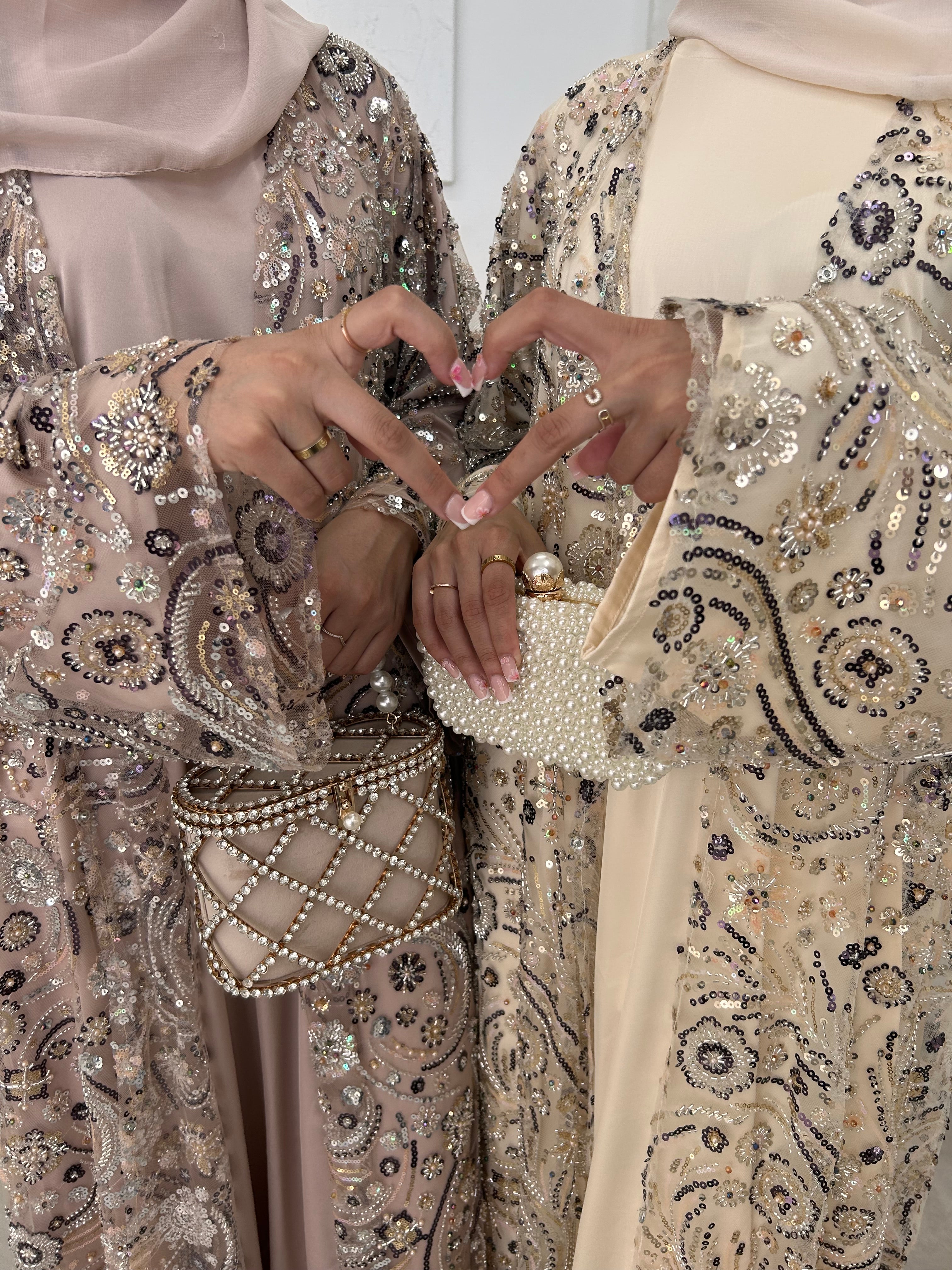 Crafted for your standout moments. Soléne is elegance in motion — a statement abaya designed with intricate embroidery, hand-finished beadwork, and layered sequin detailing that catch the light with every step.