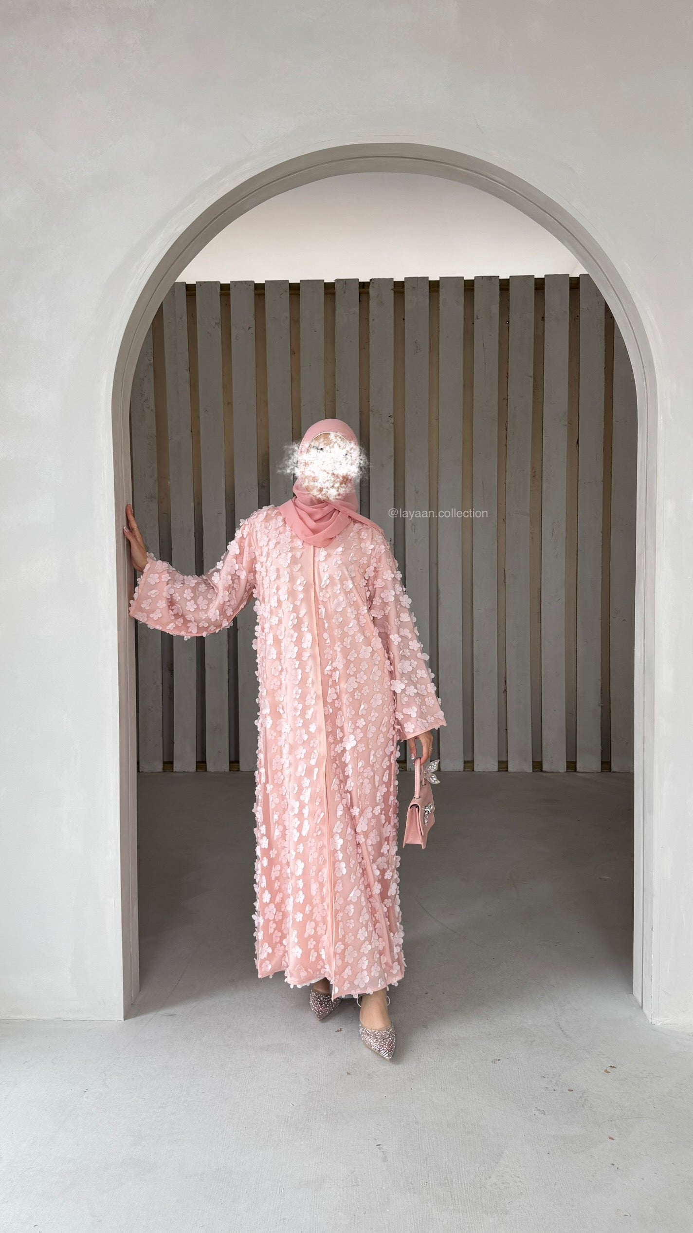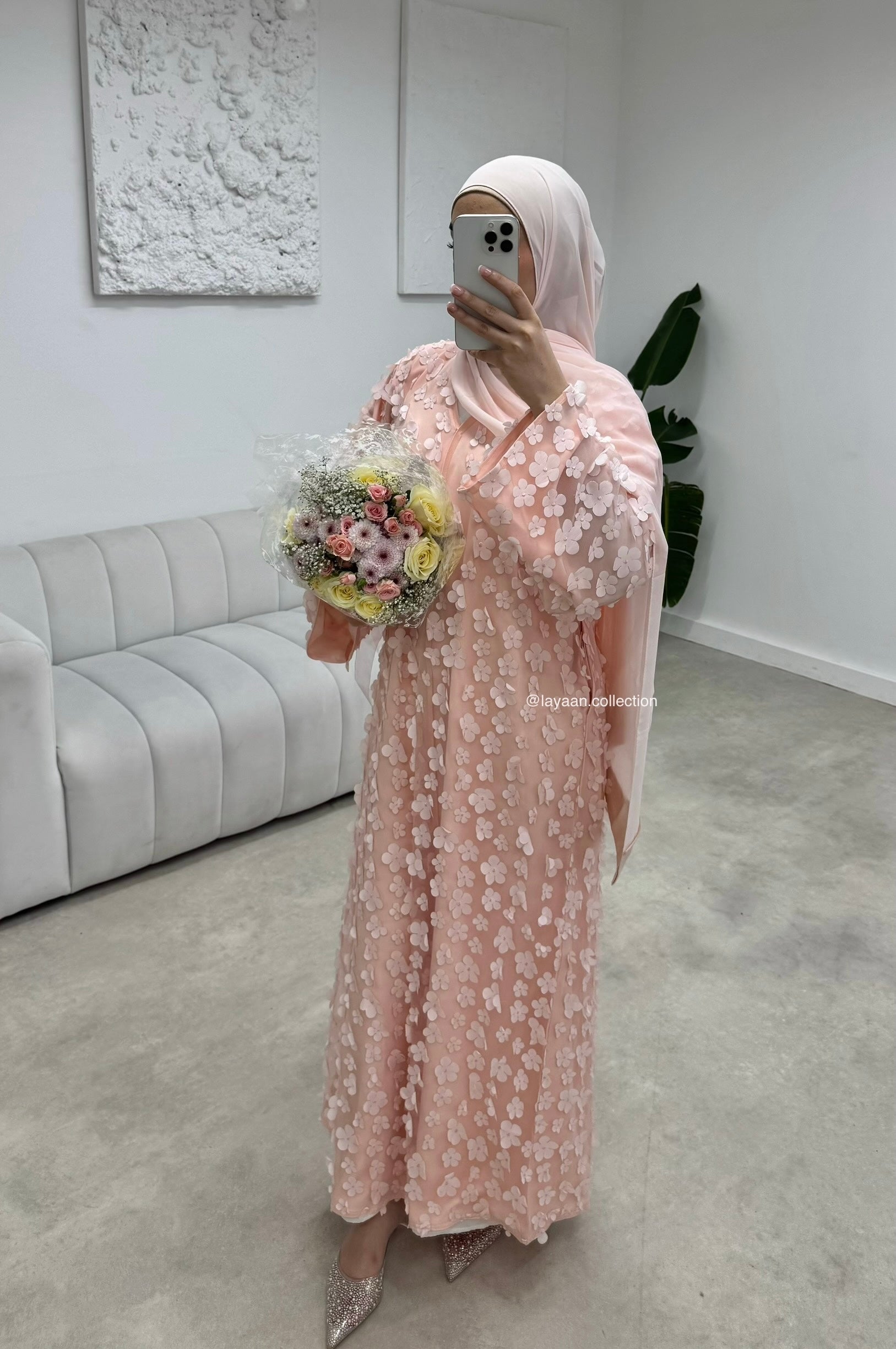 This stunning abaya is crafted from luxurious Nidha and chiffon fabric, offering a soft and elegant drape. The design features delicate 3D floral embellishments that add a touch of sophistication and charm. Its versatile style is complemented by practical details, including pockets on both sides, a matching belt for a cinched silhouette, and a full lining for added comfort and modesty. The abaya’s pastel hue enhances its graceful aesthetic, making it perfect for special occasions or elevating everyday wear. This abaya pairs perfectly with our satin slip!