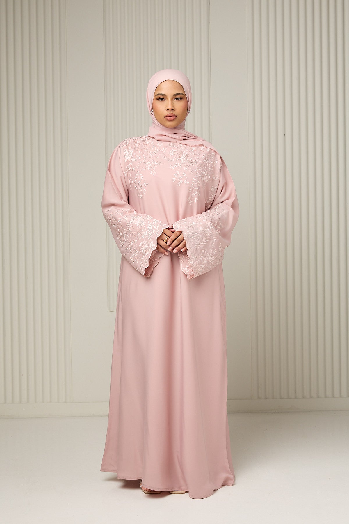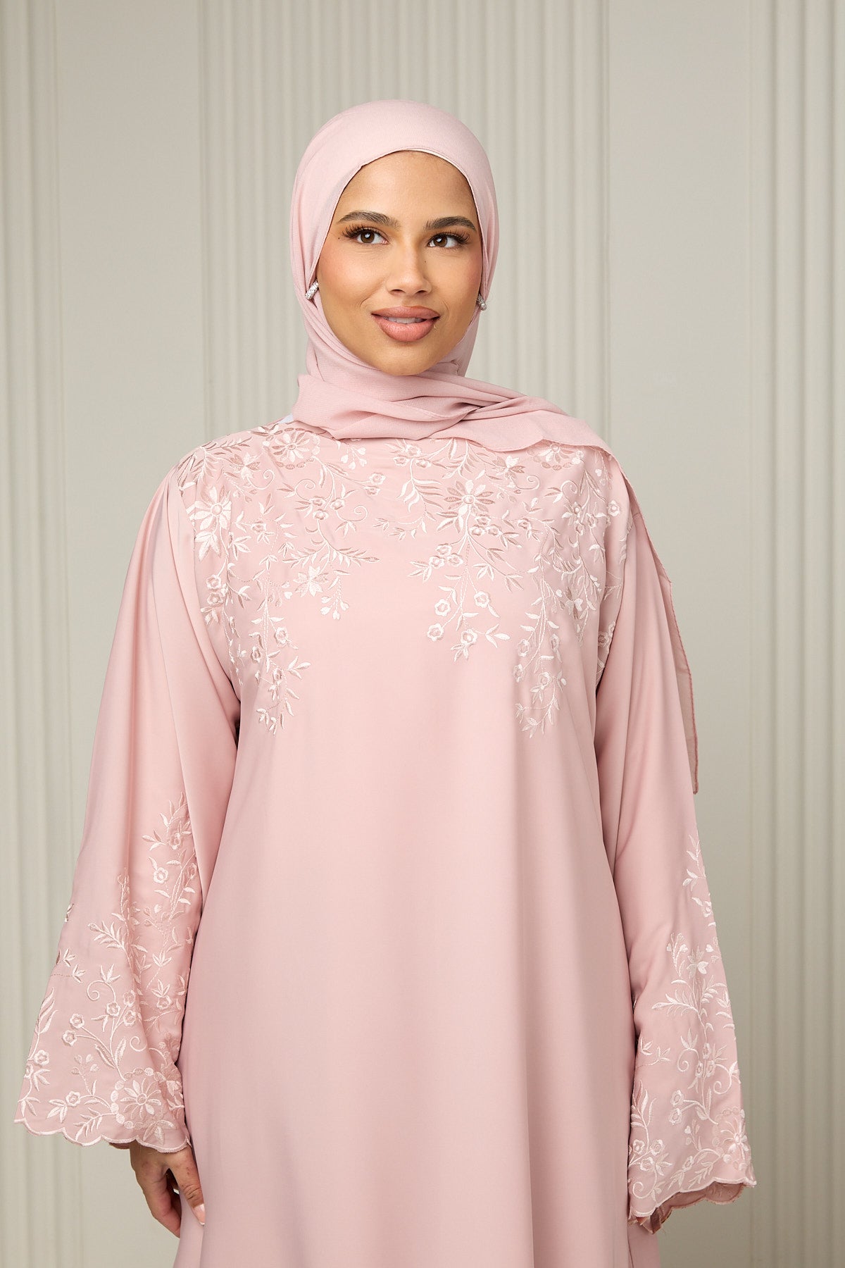 A refined embroidered design crafted from lightweight Sula fabric, featuring intricate floral detailing across the upper bodice and sleeves for a softly structured finish. Designed with a delicate scalloped neckline to mirror the scalloped sleeves, it is finished with a matching hijab. Ideal for Ramadan, Eid, and formal occasions.